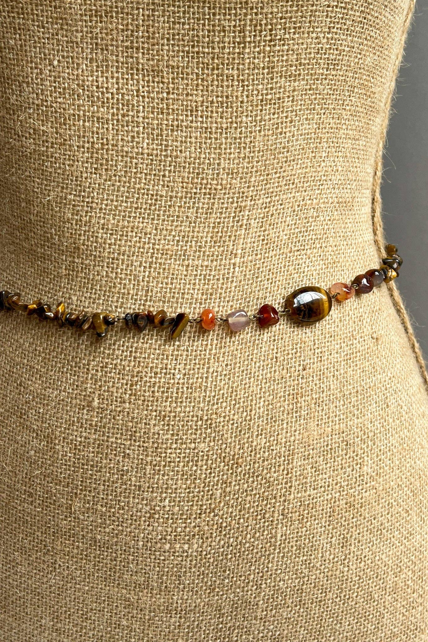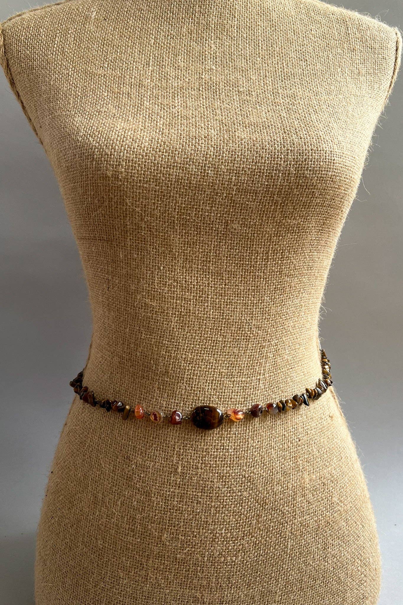 Bronze chain belt with chip stone beads and soldered stone pendants.
