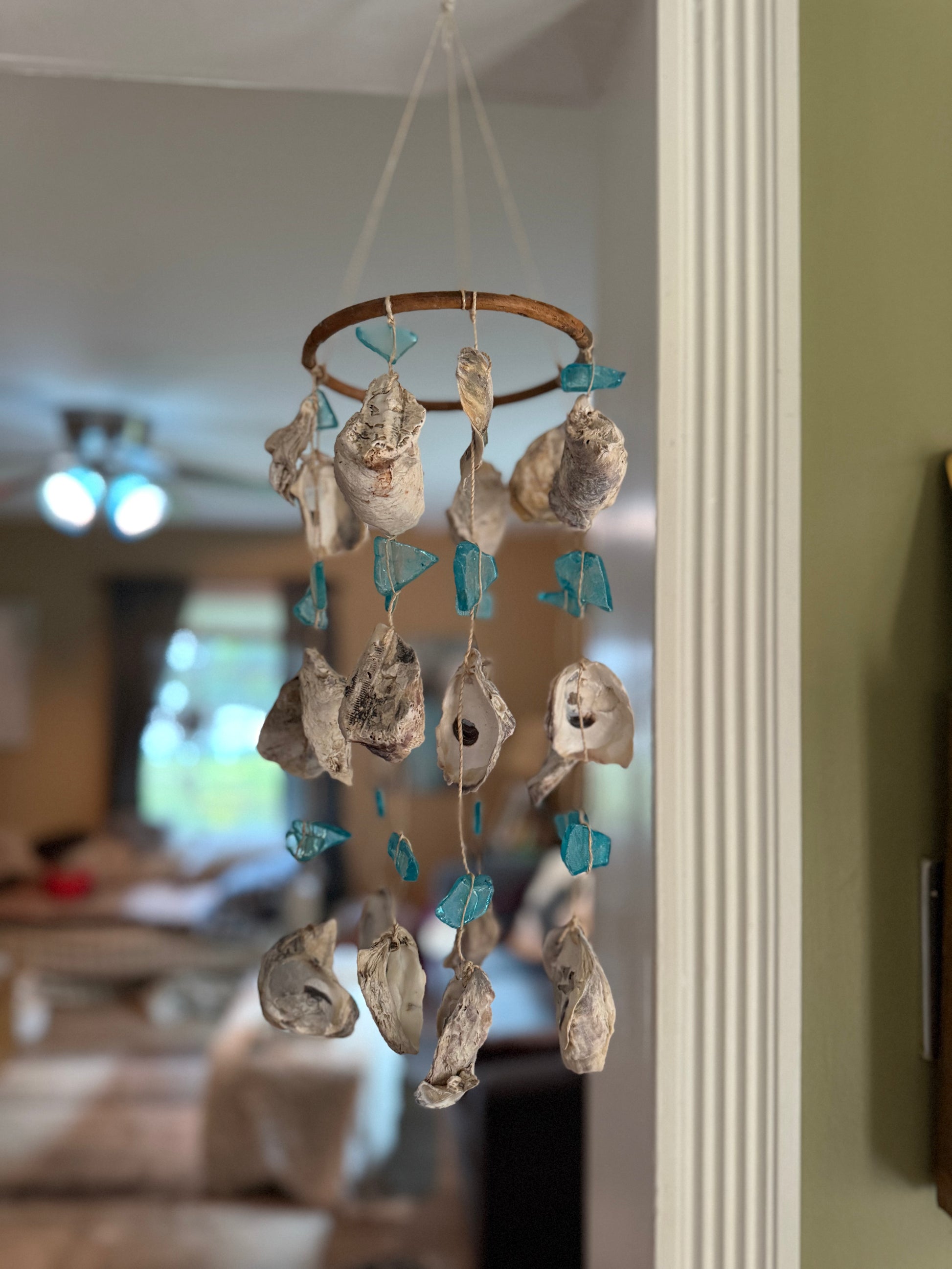 Assorted pieces of oyster shell and sea glass in an approximately 2 foot hanging wind chime. Works well alone or paired with multiples.